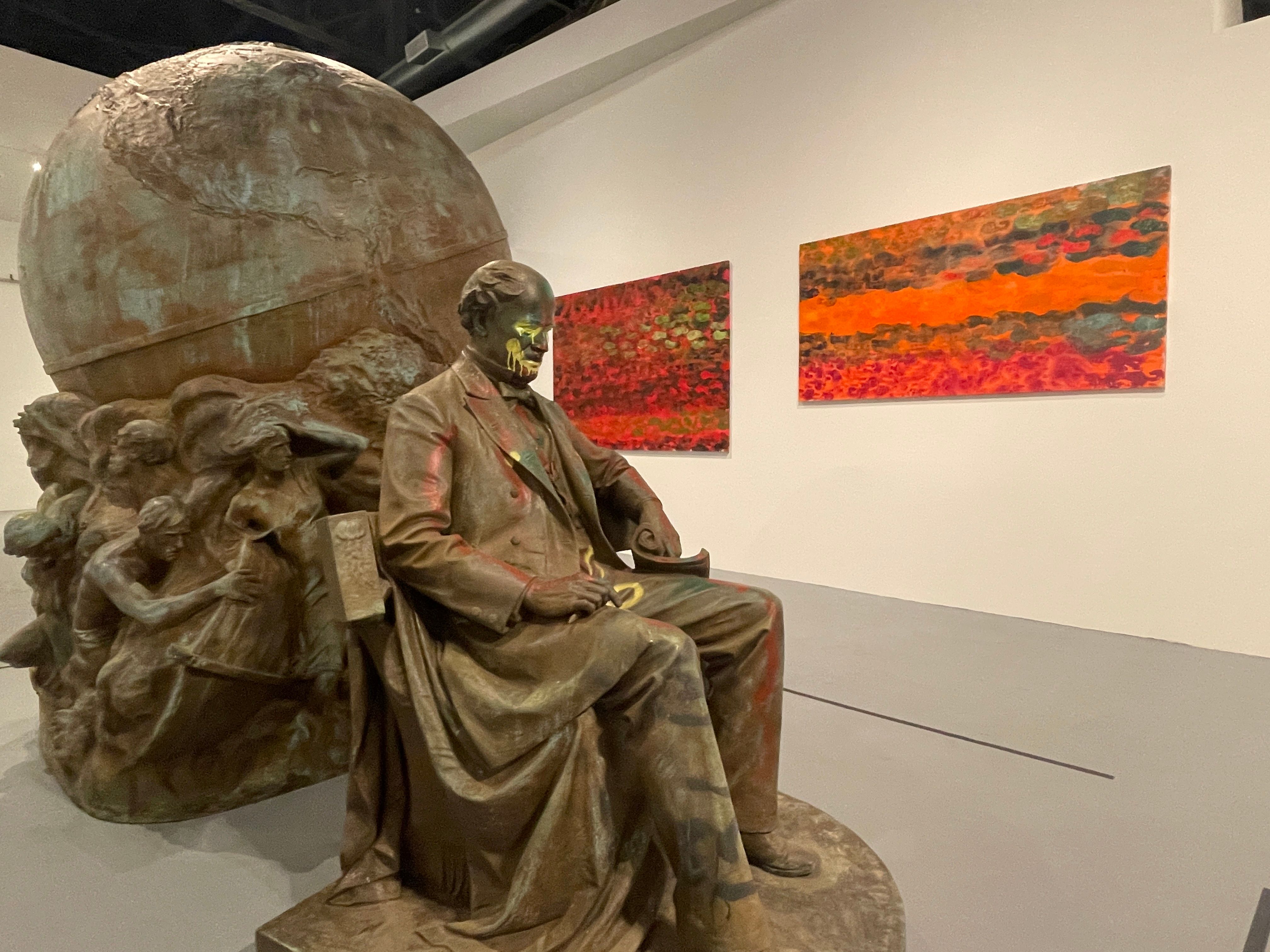 Installation view from MOCA’s Monuments show, of some dead white asshole’s statute covered in graffiti, surrounded by work by Walter Price. Photo by Colin Dickey.